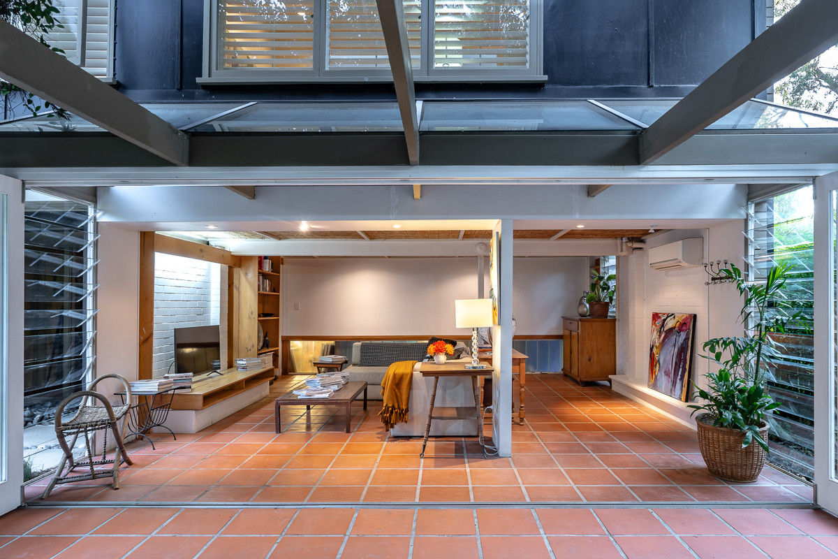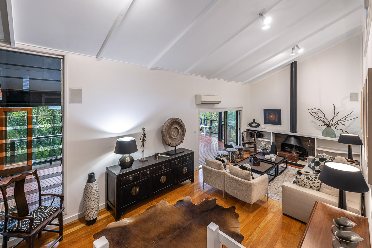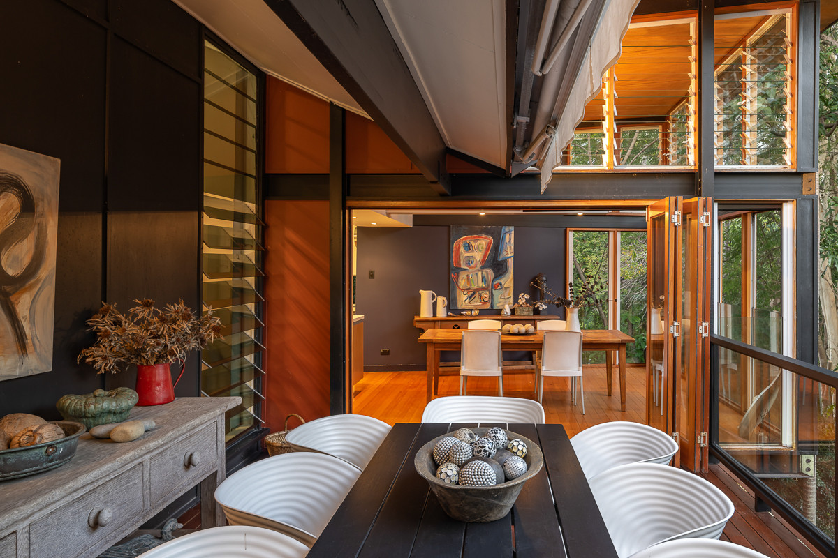 The living room, with its soaring raked ceilings and exposed beams, reflects the home's modernist design pedigree. Bathed in light from three sides, the space is designed for both relaxation and entertaining, featuring louvre windows to control breezes during the warmer months and a cozy wood-burning fireplace for the cooler seasons.