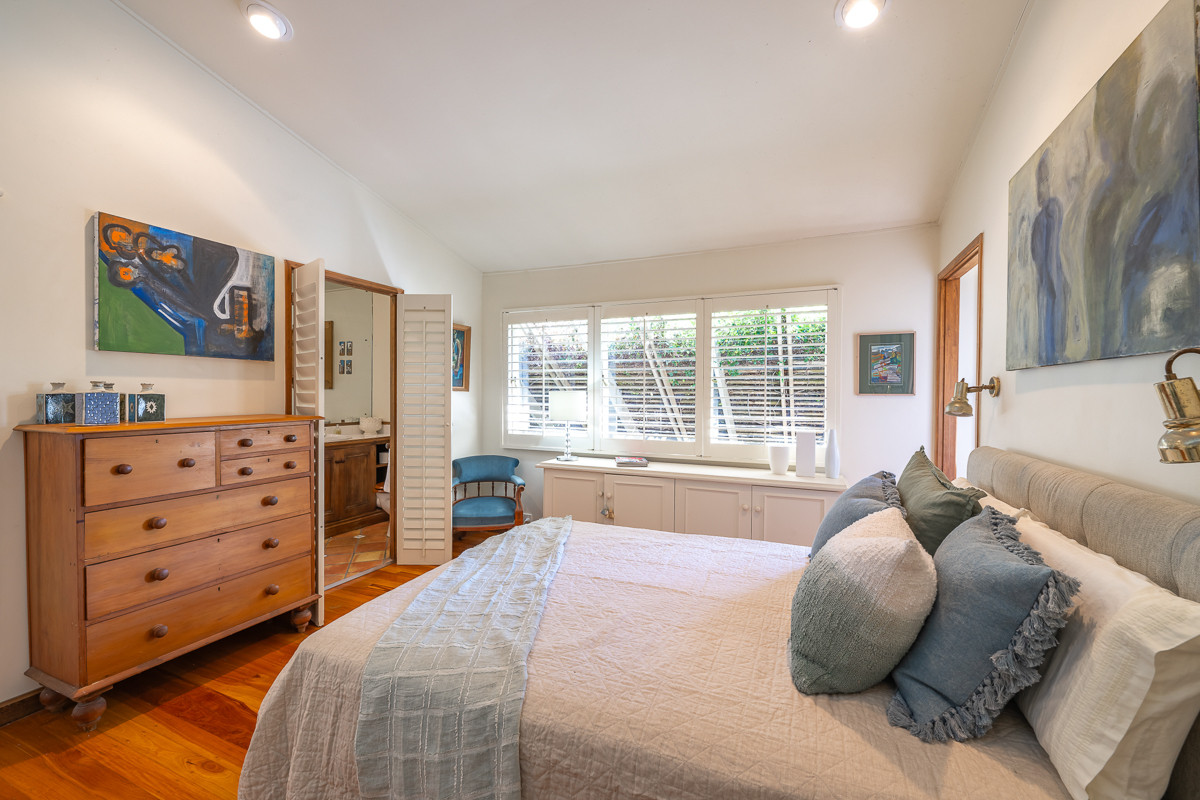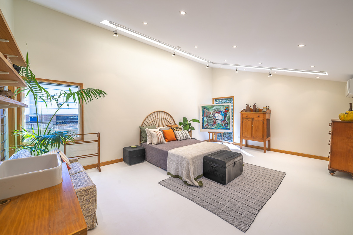 This stylish modernist home is defined by split-level design, soaring raked ceilings and thoughtfully placed skylights that bathe the interiors in natural light. The home's artistic legacy is evident in every detail—an inspired creation lovingly owned since 1975 by a celebrated artist whose creative spirit still infuses the space. The property's unique floor plan adapts effortlessly to contemporary living, offering an abundance of options to tailor the space to your lifestyle.