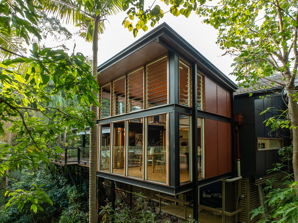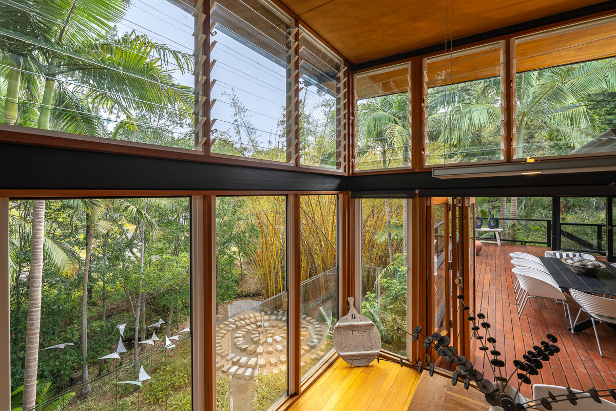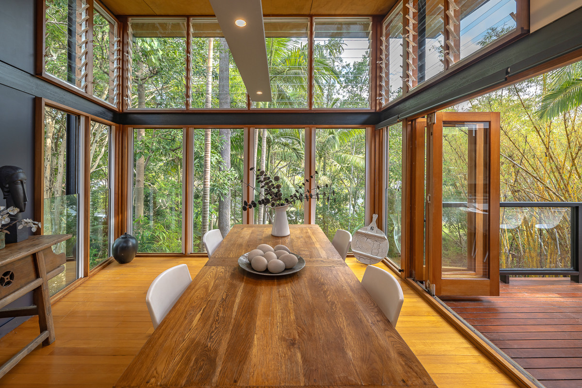 The dining table is positioned beneath a tall void and surrounded by double-storey windows, creating the impression of dining in the treetops.