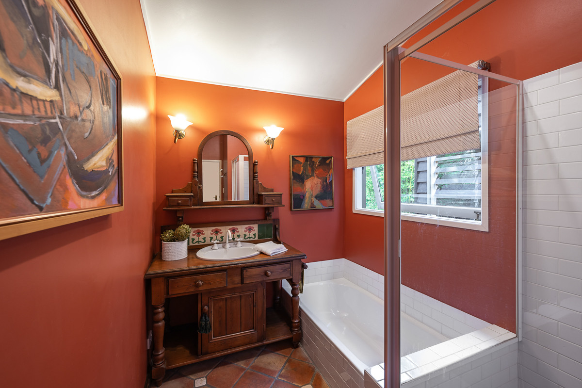 This bathroom features colonial style washstand, separate bath, separate shower, along with a separate toilet. The third bedroom, an artist's studio enjoys light streaming in from three sides and a skylight that stretches the length of the room.