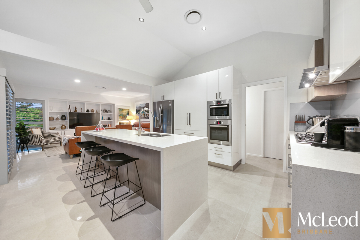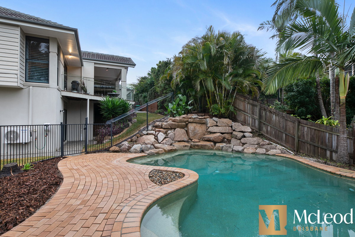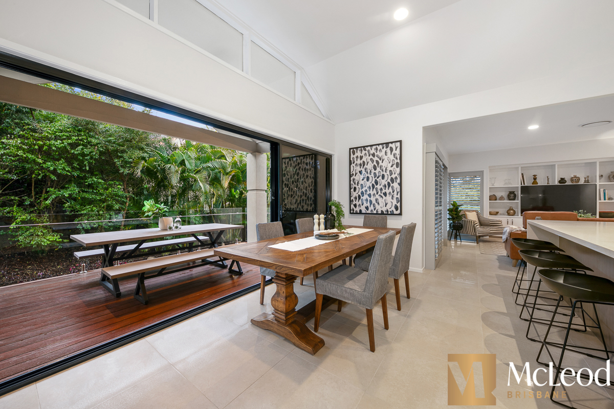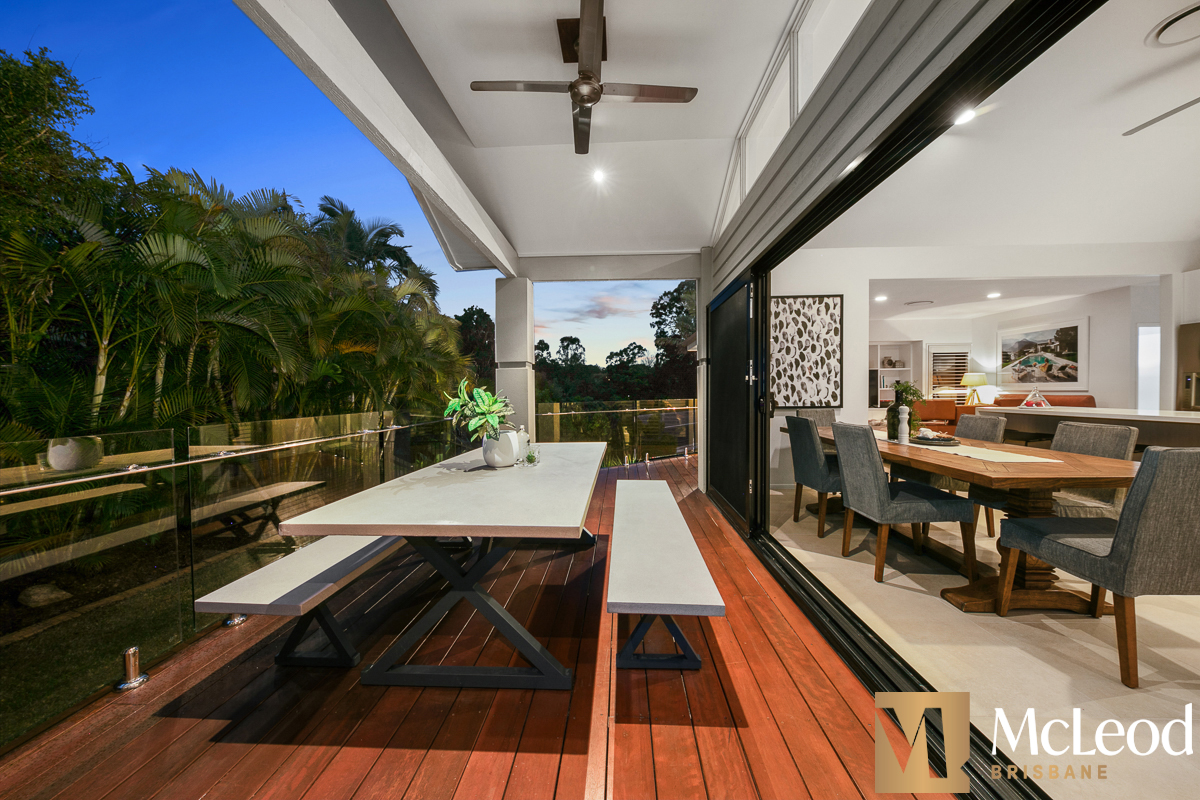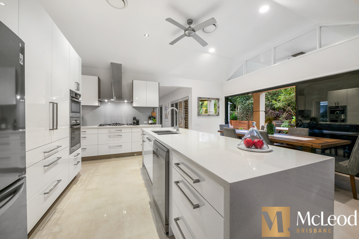 The seamless flow from inside to outside is exceptional and certainly what every Brisbane family needs for family gatherings and large party entertaining. There is space to lounge outdoors and to take advantage of the private green outlook towards Mt Coot-tha or to watch weekend sport on the wall mounted tv. Plus there is also space on the rear deck for alfresco dining overlooking the salt water inground pool complete with waterfall.