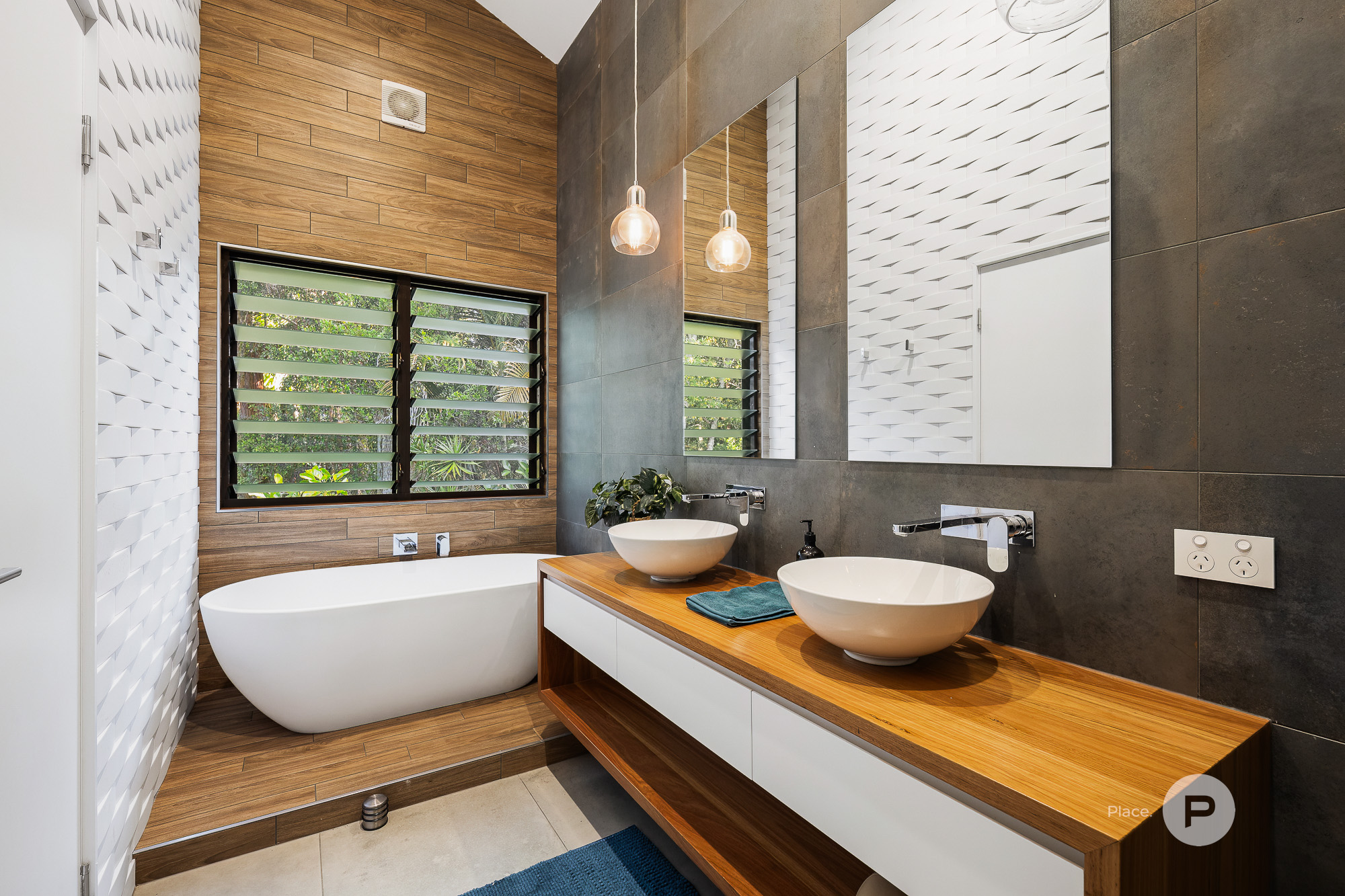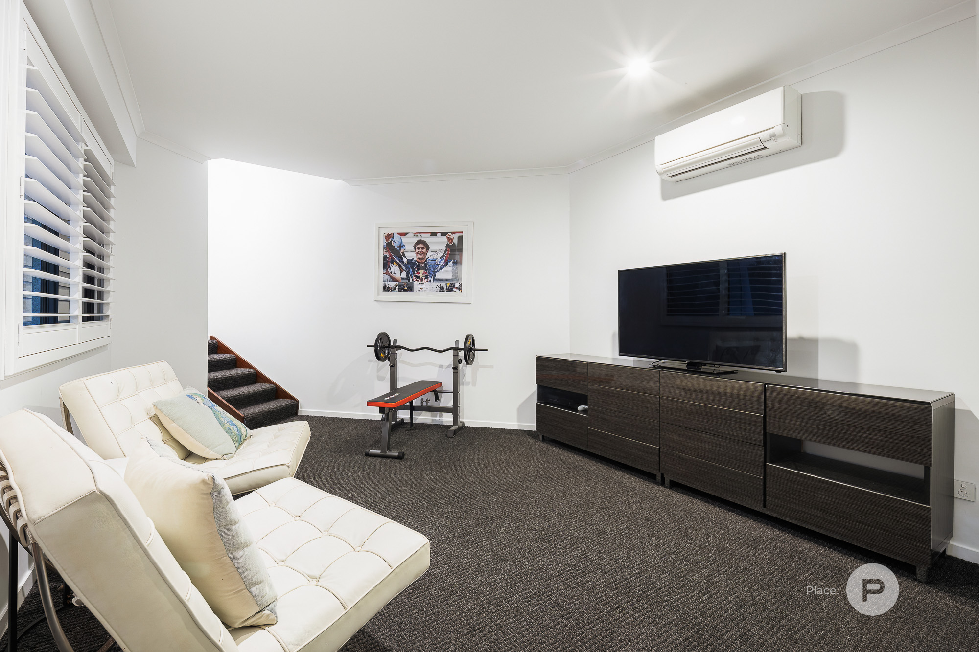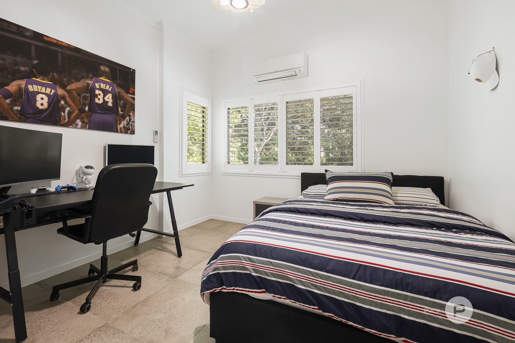 Private Master Retreat & Versatile Bedrooms The opulent master suite is a true retreat, complete with a luxurious walk-in robe, a hotel-style ensuite, and a private deck with tranquil views. Adjacent is a large home office—perfect for running a business from home, or easily convertible to a music or playroom. This level also includes three additional bedrooms, one currently used as a second office, another serving as a well-appointed home gym. All bedrooms come with built-in wardrobes and air conditioning. A stylish family bathroom, featuring double vanities and a striking stone bathtub, services these rooms.