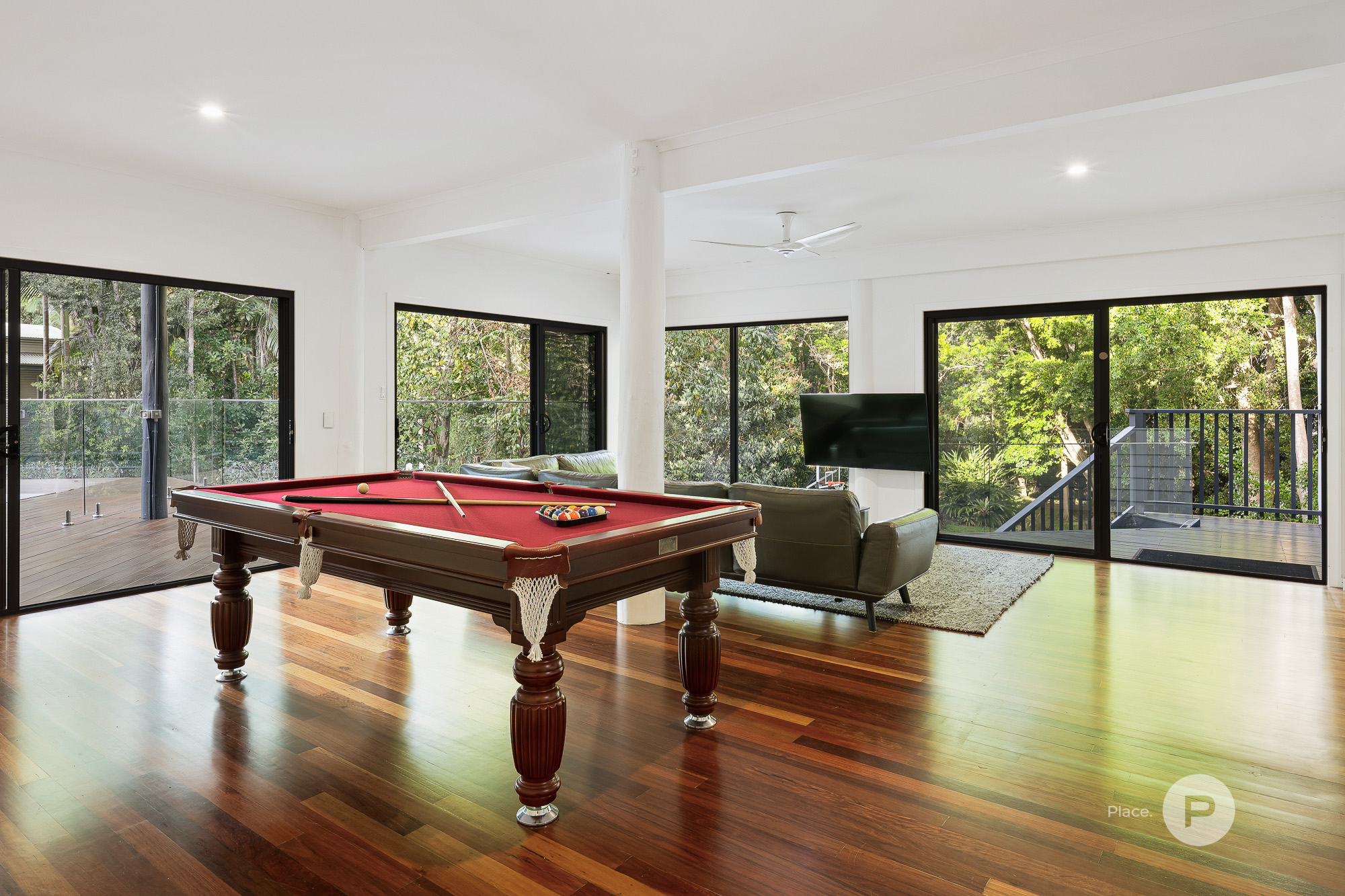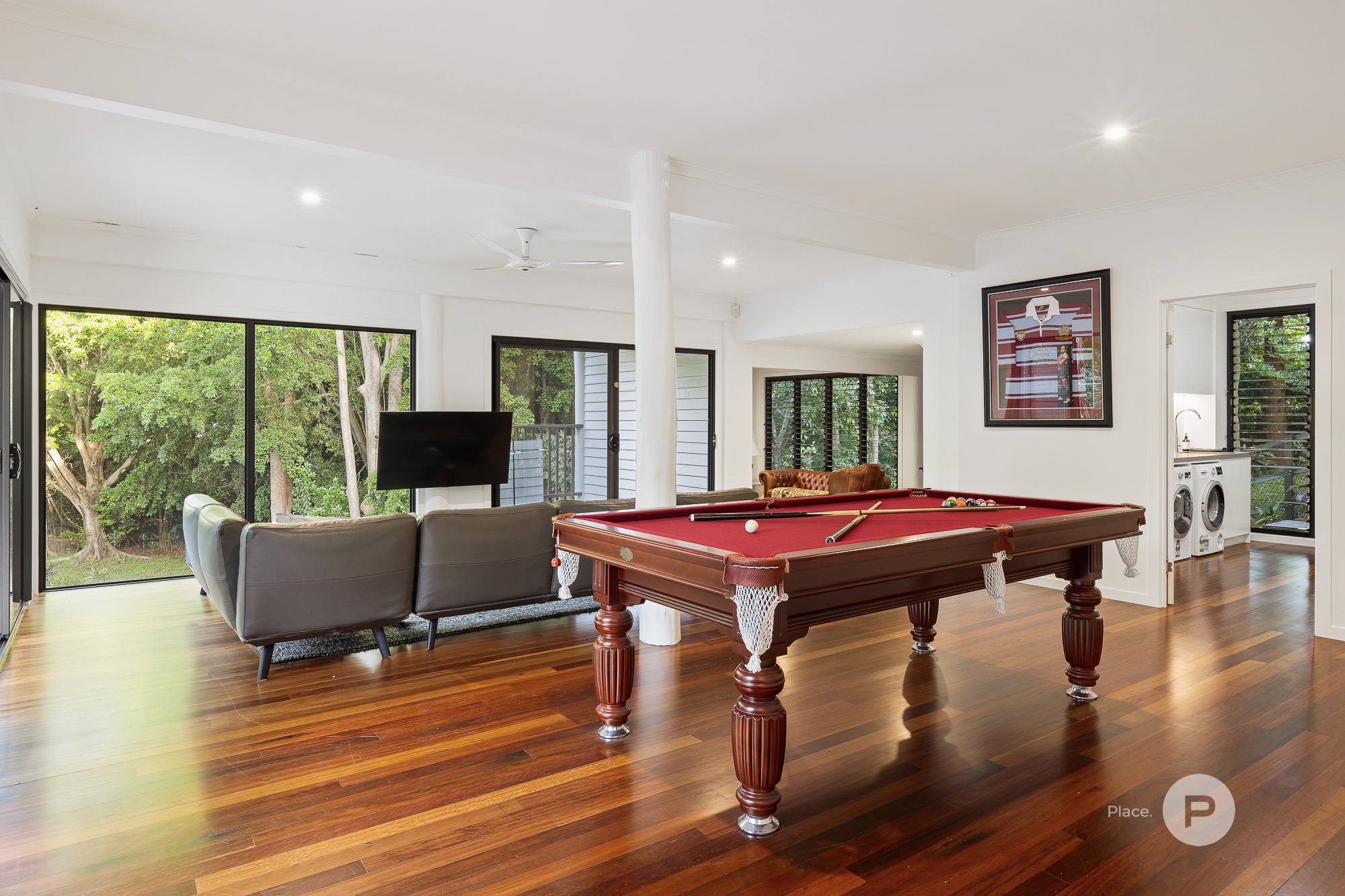 Downstairs Oasis & Guest Accommodation Downstairs, multiple living areas connect to another expansive timber deck, surrounding the pool and offering additional spaces to enjoy Queensland’s outdoor lifestyle. This level includes two more bedrooms, one with its own private retreat, and a family-sized laundry that could easily be converted into a kitchenette, making this area ideal for guests, multi-generational living, or older children seeking more independence.