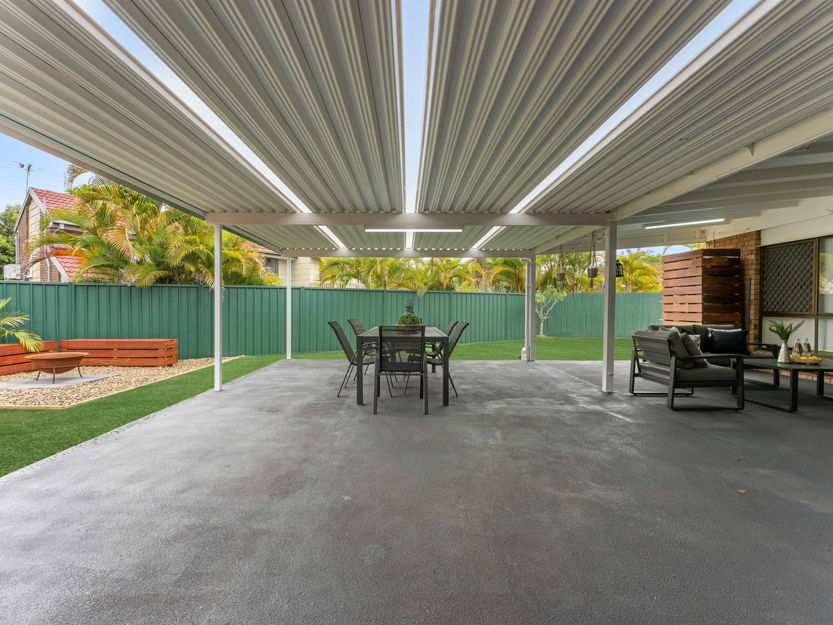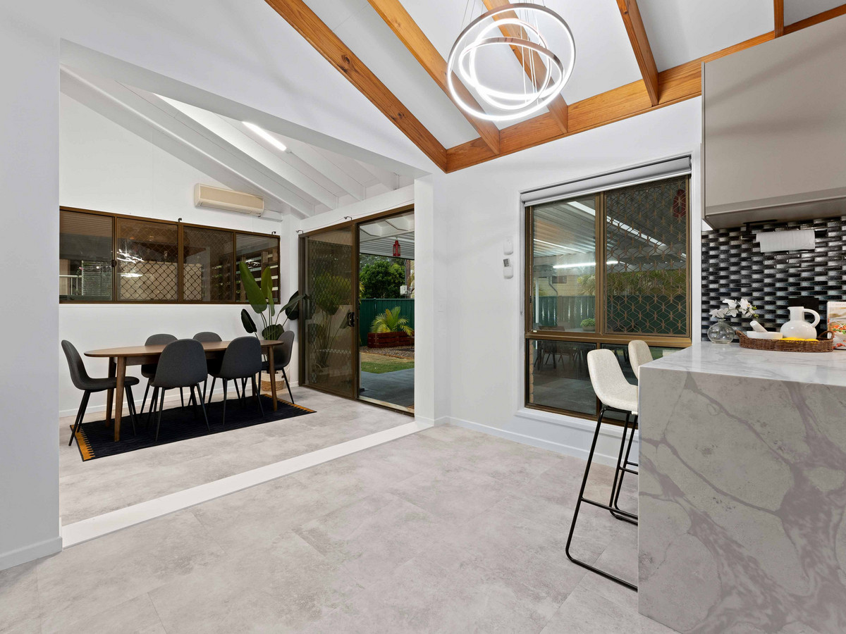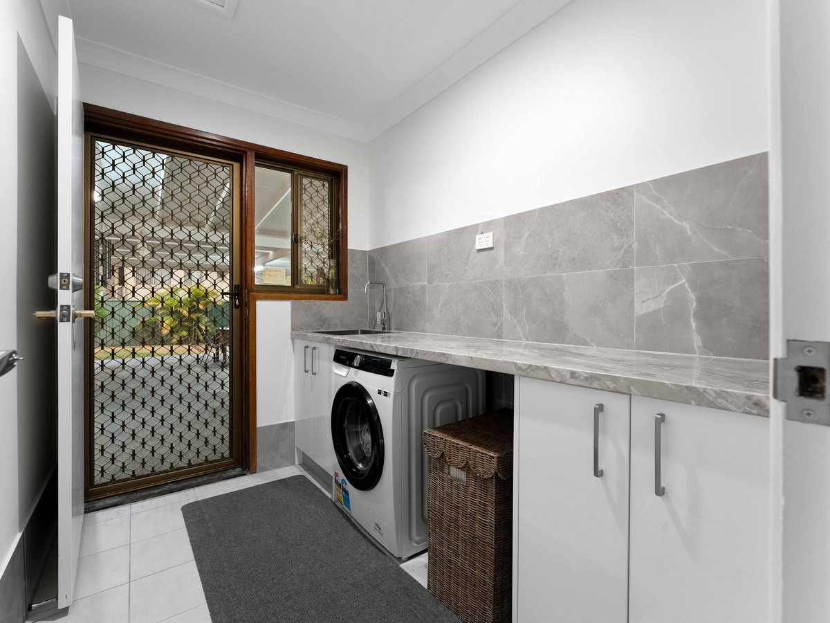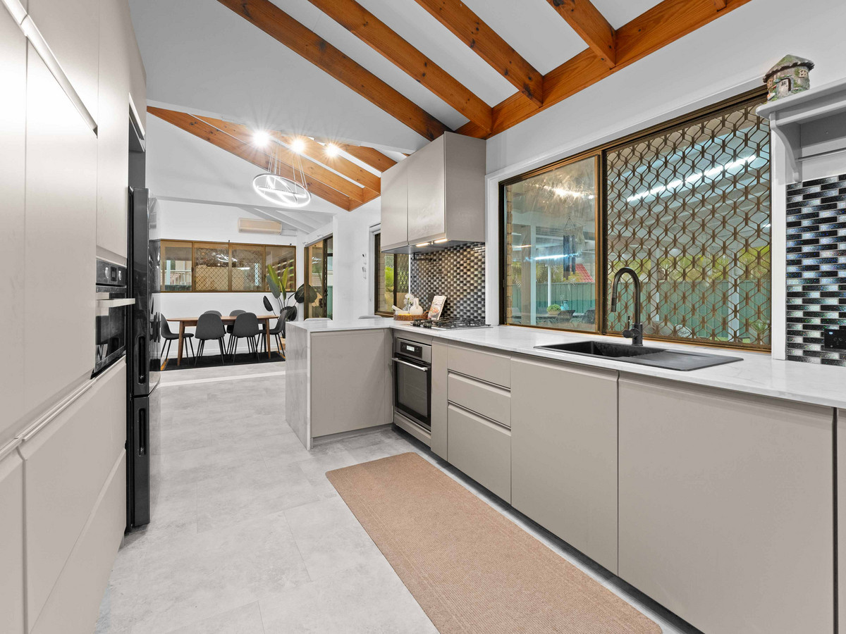 • Four sizeable bedrooms; including a large master suite with WIR, ensuite, split system A/C, fans and block out blinds. All remaining bedrooms with BIR, fans and block out curtains serviced by a second bathroom with bathtub, free standing shower, vanity and separate toilet. • Multiple indoor and outdoor living areas including formal living, main living, and dining opening to the low maintenance outdoor entertainment area. Fans and A/C ensure the areas are enjoyed in comfort. • Outdoor alfresco area opening out to the spacious rear yard backing, ideally for entertaining family and friends. • An open-plan, stylishly renovated kitchen, well-appointed with an island stone benchtop doubling up as a breakfast bar and premium appliances including a four-burner gas cooktop, electric oven, freestanding rangehood, and Split System A/C. • Secure Double Lock-up electric closed carport.