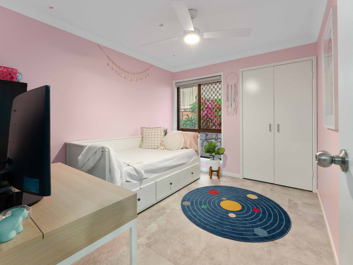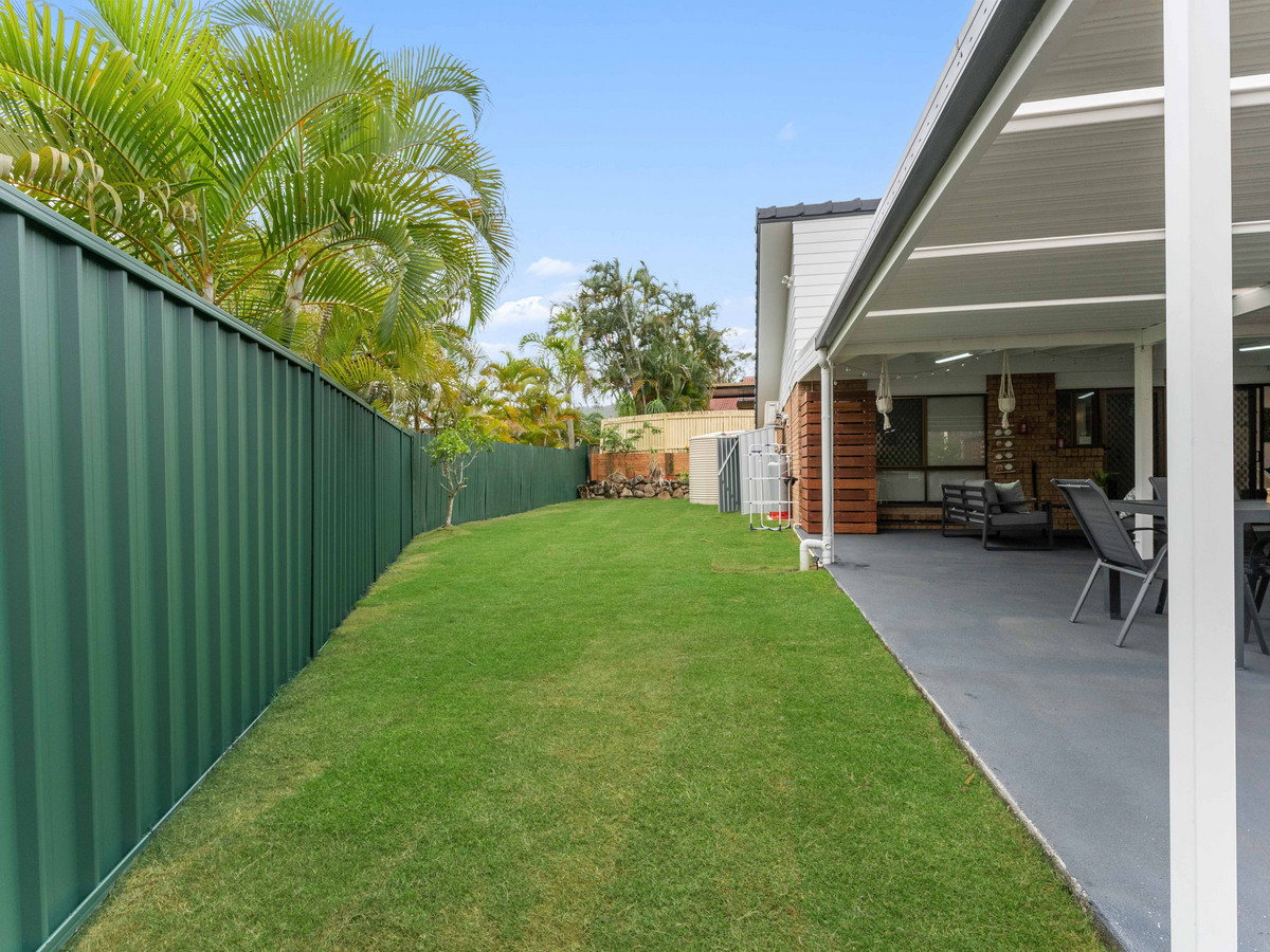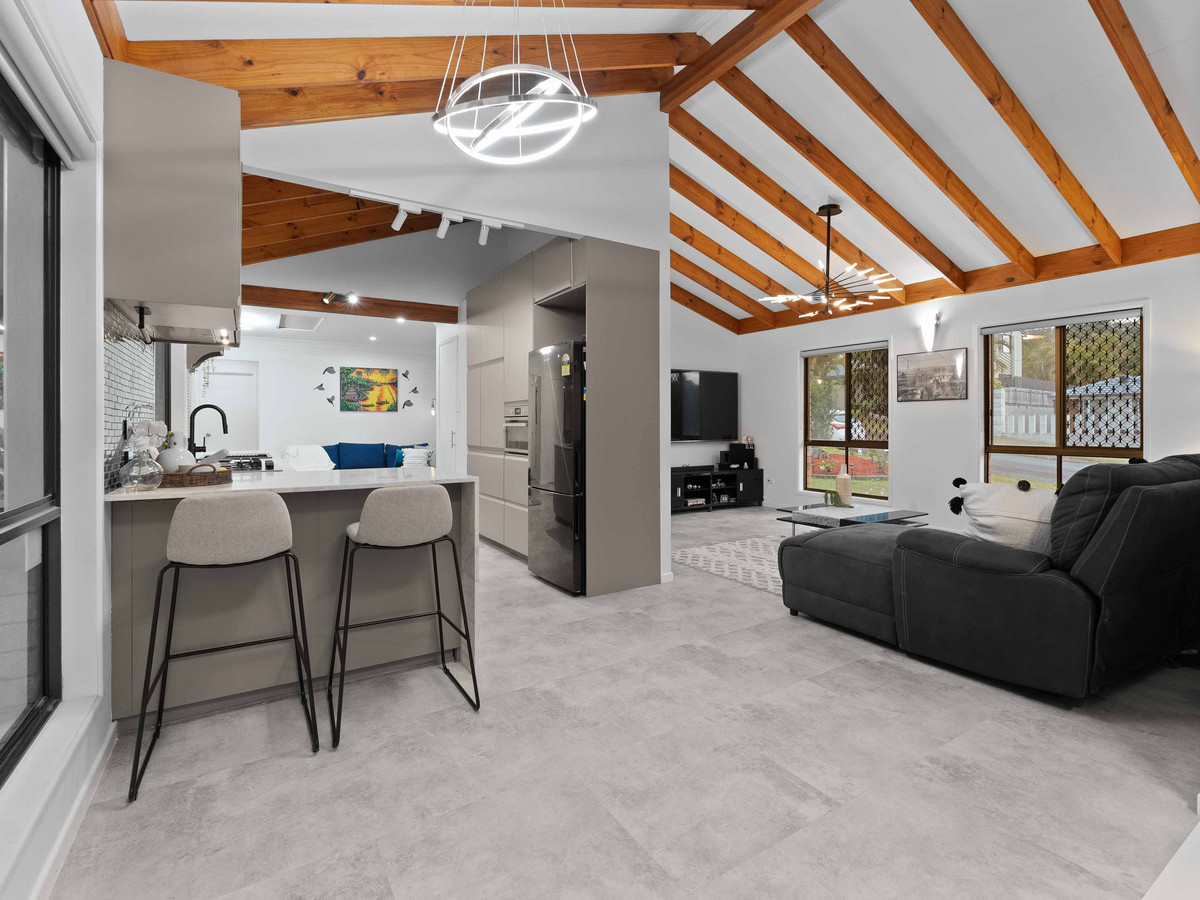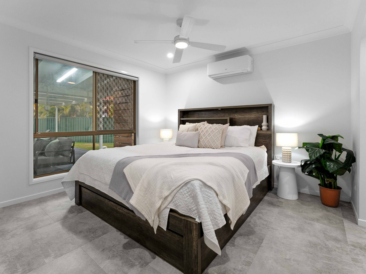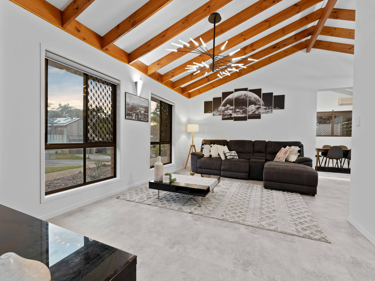 • Four sizeable bedrooms; including a large master suite with WIR, ensuite, split system A/C, fans and block out blinds. All remaining bedrooms with BIR, fans and block out curtains serviced by a second bathroom with bathtub, free standing shower, vanity and separate toilet. • Multiple indoor and outdoor living areas including formal living, main living, and dining opening to the low maintenance outdoor entertainment area. Fans and A/C ensure the areas are enjoyed in comfort. • Outdoor alfresco area opening out to the spacious rear yard backing, ideally for entertaining family and friends. • An open-plan, stylishly renovated kitchen, well-appointed with an island stone benchtop doubling up as a breakfast bar and premium appliances including a four-burner gas cooktop, electric oven, freestanding rangehood, and Split System A/C. • Secure Double Lock-up electric closed carport.