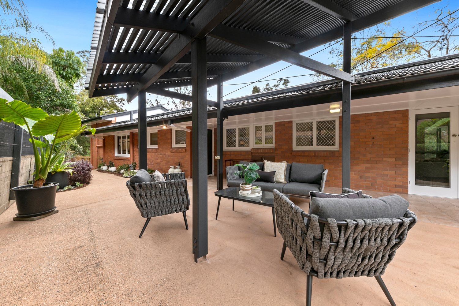 the covered rear patio which is very large flowing directly from the kitchen, 2. the paved garden area secluded amongst the trees and 3. along the front covered verandah which has a wonderful treed outlook.
