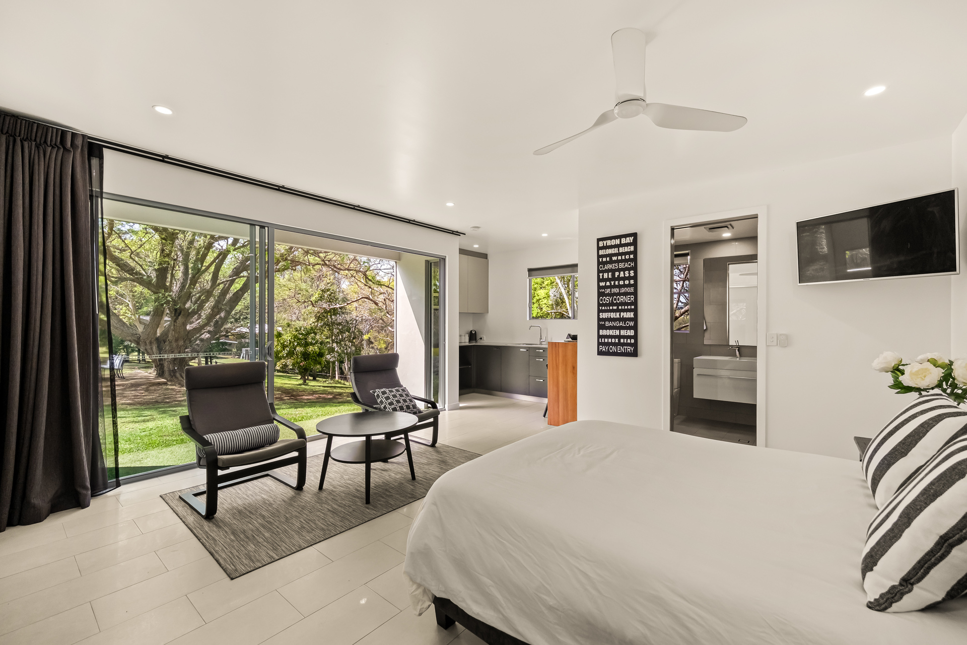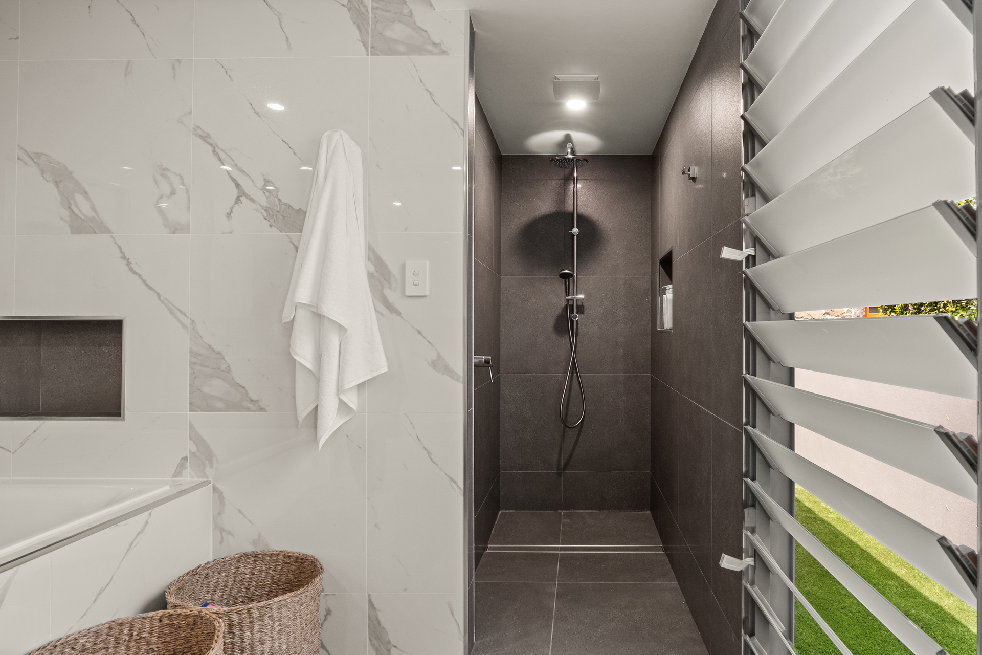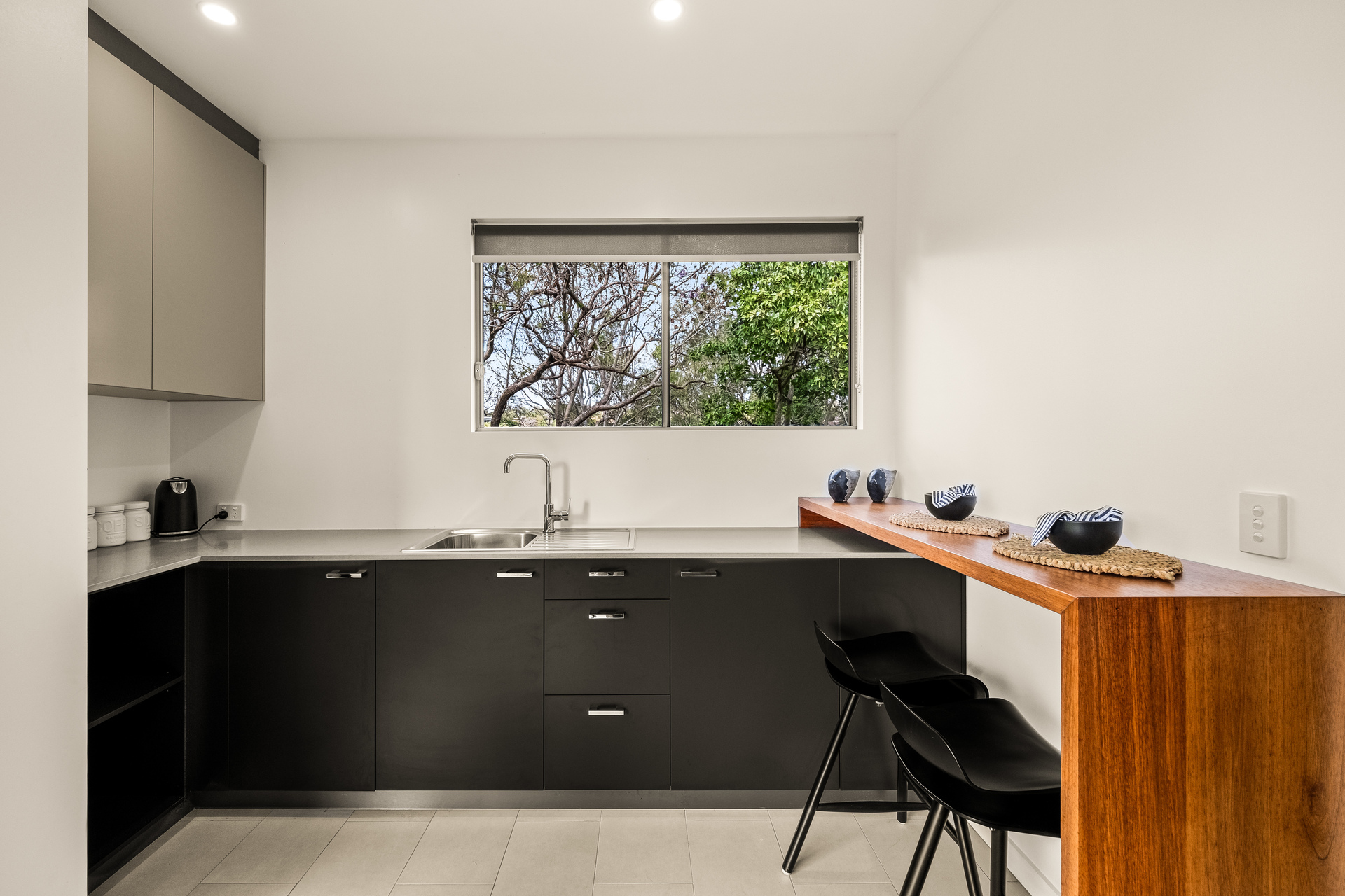 SELF-CONTAINED PAVILION Two self-contained levels or used in combination as a full second dwelling Timber decks Kitchen + kitchenette + alfresco kitchen with b/in BBQ Full bathrooms on both levels 2 x large lockup storage areas on the lower level