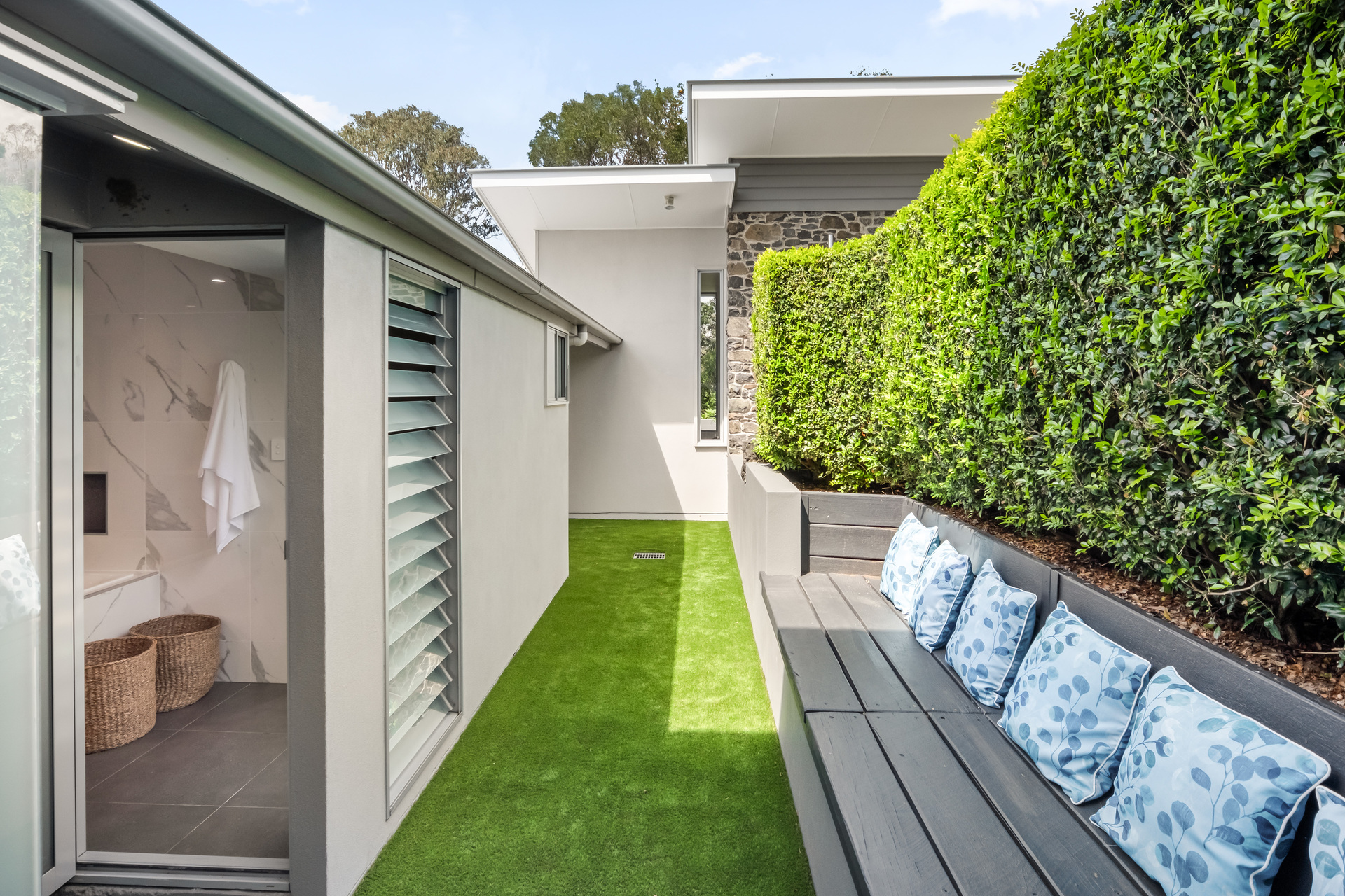 MAIN PAVILION Gourmet kitchen with VZug appliances, butlers pantry and Zip Tap All bedrooms w/ custom-built wardrobes Main bathroom w/ pressed steel bathtub & private courtyard Study with built-in desk & extensive shelving Hedged landscaping & hand-crafted artisan stone walling Polished timber decks Remote access video security intercom & automatic entrance gate Second separate gated access from Nioka Street Separate linen store/laundry/mudroom with drying area