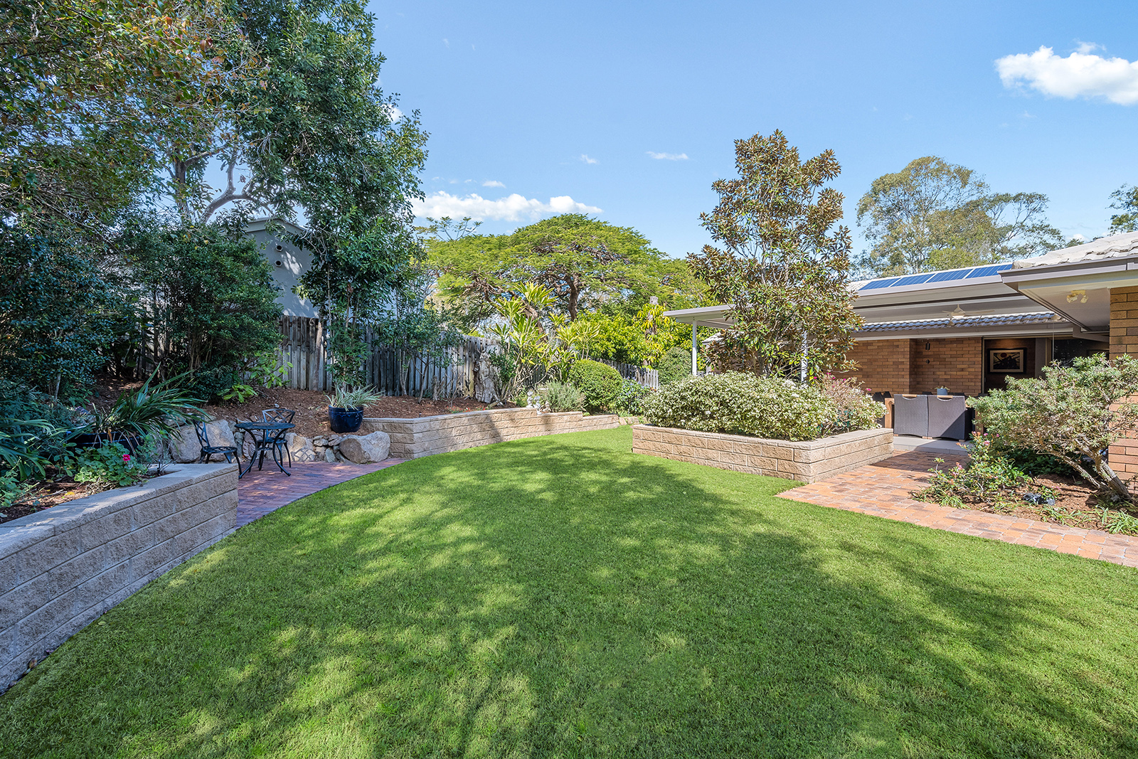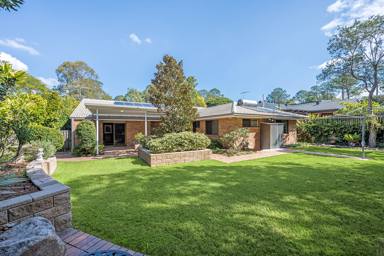 OUTSIDE THE HOME: • Substantial 868 sqm block; • Exquisite established landscaping both to front & back of the home with newly mulched garden beds featuring many native ferns & rare flowering trees, new retaining walls, new sandstone steps, brick paving & irrigation system; • Back garden is fully fenced, flat & grassed for kids and pets & includes garden shed & clothesline; • Covered front patio to shade family & entertainment areas; • Fantastic covered back patio for entertaining has fully insulated ceiling, ceiling fan & full-length roller blind - making it perfect for alfresco dining in any weather; • Sixteen panel solar system on roof of home plus two panel Solarhart hot water system.