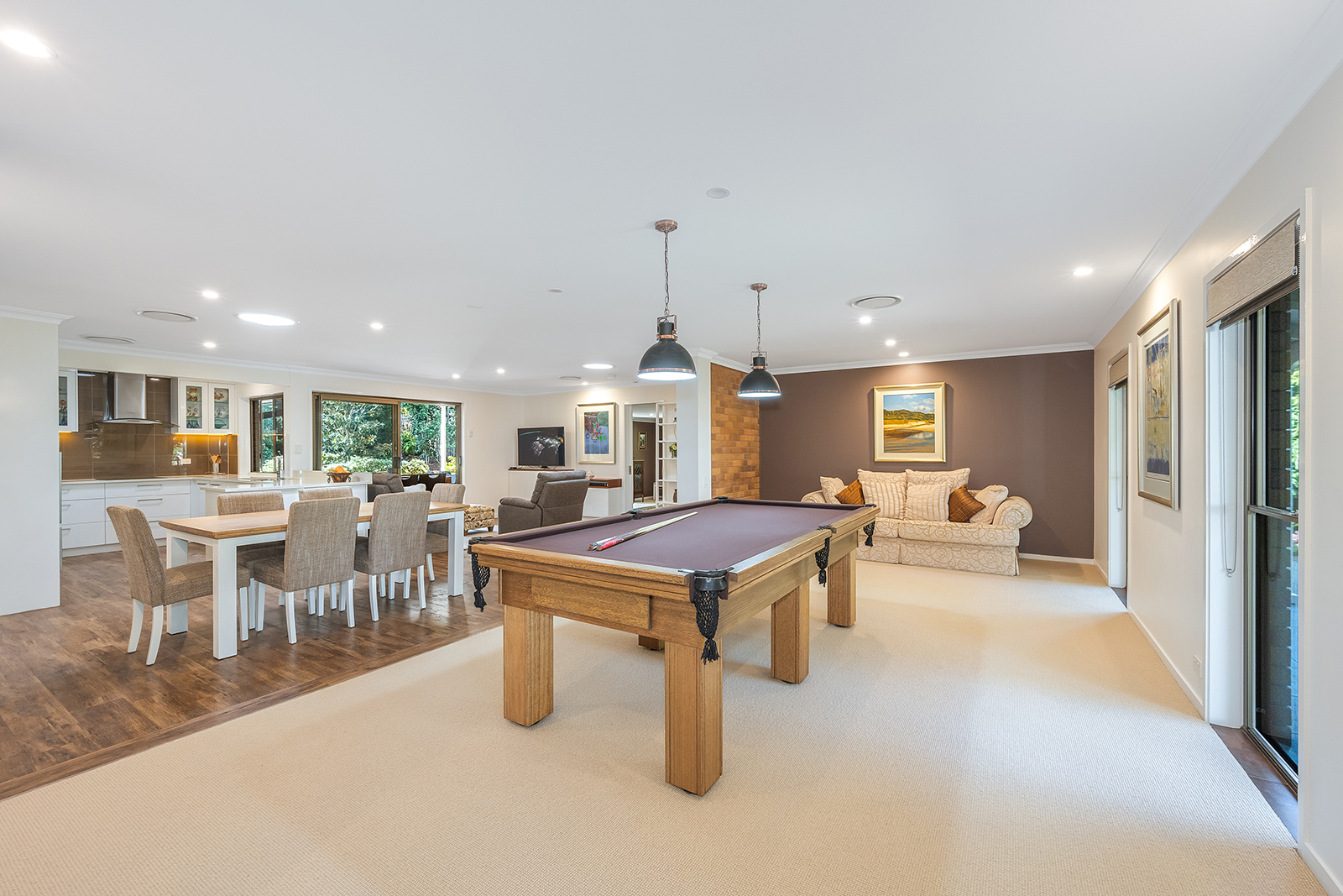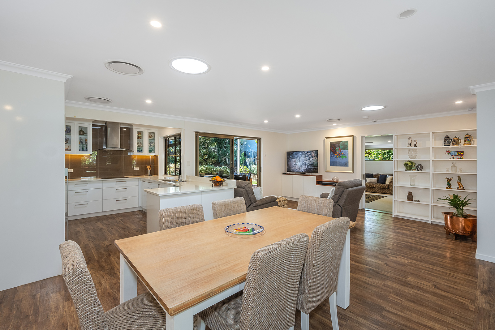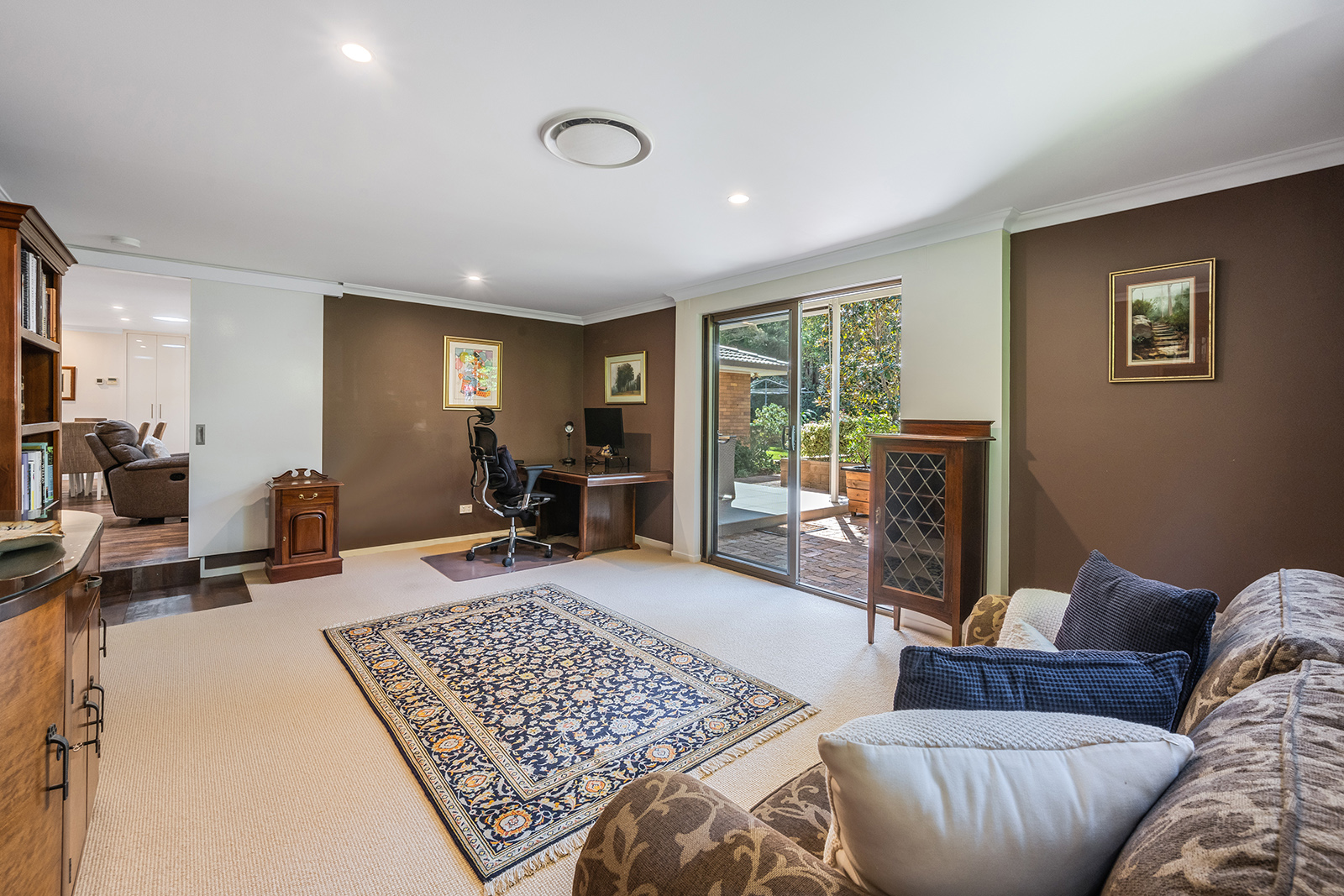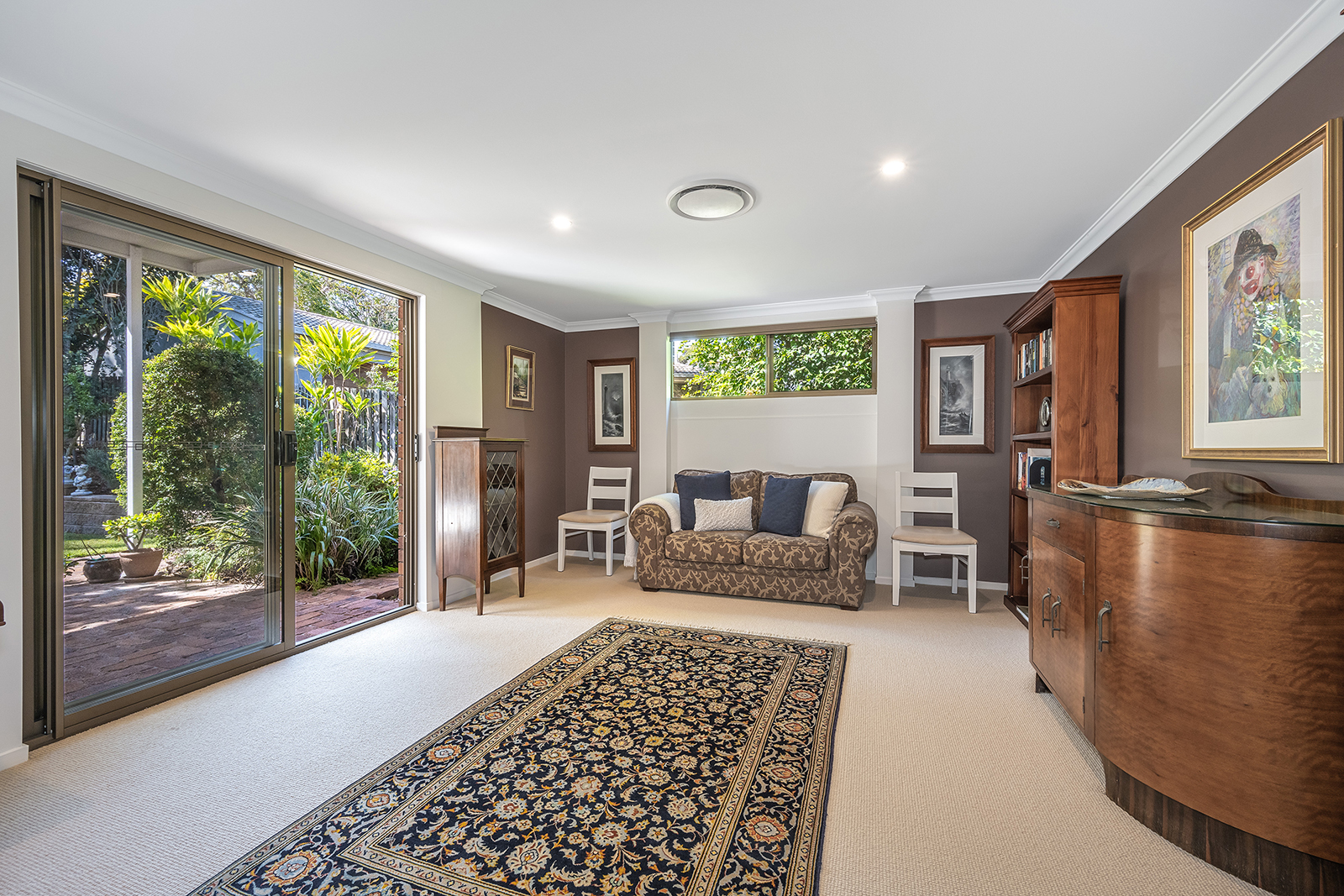 INSIDE THE HOME: • Statement tiled flooring greets you in entryway; • Sprawling open plan living and entertaining at the heart of the home with living, dining, family & kitchen all flowing seamlessly into one another; • While open-plan, the family area to the front is distinguished from the living by carpeted floor & exposed brick feature walls and has double blinds (both blackout & translucent daytime blinds) as well as specialist gimbal lighting for displaying artwork; • Living / dining / kitchen all feature hybrid timber flooring, plus storage cupboard to dining, built-in red-cedar topped entertainment unit in living & back patio access through sliding glass screened doors; • Modern chef's kitchen will be all the motivation you need to hone your culinary skills with Smeg oven & induction cooktop & Bosch dishwasher as well as plenty of stone countertop, a large pantry & extensive storage space in soft-close drawers & cupboards; • Carpeted rumpus room could be converted to additional 5th bedroom, teenage escape or home office. Features direct back patio access through sliding glass doors; • Master bedroom is carpeted with full-length built in robes & roller blinds; • Adjacent renovated bathroom is part of the master suite & features stone countertop & good storage; • One bedroom has been converted to a dressing room for the master suite with huge, tailored wardrobes, drawers, shelves, hanging space & desk area; • Two further bedrooms at the back of the home are fully carpeted with built-in robes, roller blinds & gorgeous views across the gardens; • Spacious & modern main bathroom has separate bath & shower plus vanity with a large stone countertop & mirror. Toilet is separate; • Galley laundry features built-in laundry hamper, loads of storage space with soft-close cupboards & screen door access to back patio, including dog door; • 2 car lock-up garage with automatic steel doors & new epoxy terrazzo floor also has 1m deep underfloor storage space (used by the original owner as wine cellar); • Electronic security system; • Fully ducted & zone-controllable air conditioning throughout home; • North-easterly aspect means home is very well-ventilated & requires little cooling in the summer.